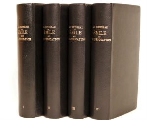 Émile, ou de l'Éducation. Amsterdam, Jean Néaulme, 1762. 4 volumes in-12, chagrin noir, dos lisse, non rogné (Reliure moderne). Contrefaçon lyonnaise de l'édition originale.