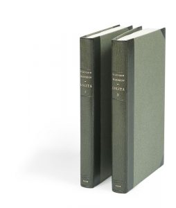 couverture conservée (Ateliers Laurenchet). Édition originale de ce roman mythique de l’écrivain américain d’origine russe Vladimir Nabokov (1899-1977). Il s’agit du chef-d’œuvre de Nabokov, qui fit scandale à l’époque, racontant l’histoire d’amour passionné et charnel d’un homme mûr, Humbert Humbert, pour une jeune “nymphette” de 12 ans du nom de Dolores Haze. Refusé par tous les éditeurs américains, c’est en France que l’ouvrage verra le jour en 1955 et deviendra l’un des romans les plus connus de la littérature mondiale. La première traduction française ne paraîtra qu’en 1959, dans la traduction d’Éric Kahane. Exemplaire de premier tirage, avec l’indication “Francs : 900” sur les quatrièmes de couverture. Comme souvent, le prix sur le premier volume a été barré par le libraire à l’époque, pour être remplacé à la main par 1200. Dans le second tirage, cette mention est recouverte par une vignette imprimée autocollante de l’éditeur. Les pages passent de 10 à 13 dans le premier volume, du fait d’une erreur de pagination. Cet exemplaire a cela de particulier qu’il présente une erreur d’impression que nous n’avons trouvée décrite nulle part, correspondant certainement à un premier tirage défectueux qui a échappé à l’imprimeur. En effet, les pages 130-131, 134-135, 138-139, 142-143, 146-147, 150-151, 154-155 et 158-159 sont restées vierges ; elles semblent correspondrent à un côté de l’impression du cahier. Très bel exemplaire relié par les ateliers Laurenchet. Le premier volume est complet des deux plats et du dos de la couverture ; le second possède les plats sans le dos. Restauration au second plat de couverture du premier volume.
