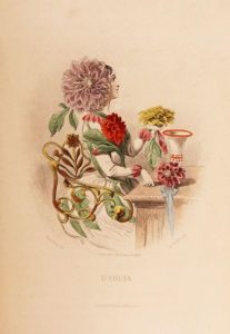 Les Fleurs animées. Paris, Garnier, 1867. 2 volumes grand in-8, demi-chagrin vert, dos orné, tranches dorées (Reliure de l'époque). Nouvelle édition, illustrée de 52 planches coloriées et gommées de Grandville, retouchées par Maubert, dont 2 frontispices, et de 2 planches de botanique en noir.