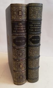 BOSSUET (J.). — • Les oraisons funèbres. — Tours, Mame, 1869. • Discours sur l'histoire universelle. Idem, 1870 ; ens. 2 vol. in-8 mar. vert, auteur et titres dor. sur les dos à nerfs finement ornés et dor., cadre de fil. dor avec au...