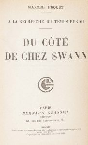 PROUST (Marcel). Du côté de chez Swann. Paris : Bernard Grasset, 1914. — In- 8, (2 ff.), 523 pp. Demi-basane bleu nuit, dos à nerfs, tranches mouchetées (reliure de l’époque). Édition originale. EXEMPLAIRE DE PREMIÈRE ÉMISSION,...