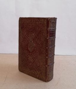 orné d’entrelacs de fil. dor. et de motifs au pointillé, armoiries et chiffre répété au centre, dos orné de fleurs de lis, roulette sur les coupes et la bordure intérieure, tr. dor. sur marbrure (Rel. de l’époque).