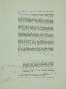 Georges Mathieu, Simon Hantaï et Stéphane Lupasco. Le tract parut 2 jours avant la fin des manifestations. UN DES 40 EXEMPLAIRES NUMÉROTÉS SUR PAPIER VERT PÂLE, justifiés à la main et portant les signatures, chacune d’une couleur différente, de 8 des signataires : André Breton, Gérard Legrand, Jean-Louis Bédouin, Charles Flamand, Jean Schuster, Benjamin Péret, Robert Bennayoun et Joyce Mansour. On trouve également la signature d’Édouard Léon Théodore Mesens qui ne figure pas dans la liste des signataires du tract. Exemplaire parfaitement conservé. Pliure centrale.
