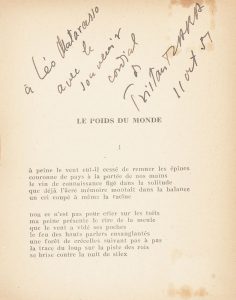 TZARA (Tristan). Le Poids du monde. Saint-Girons : Au Colporteur, 1951. — In- 16, (8 ff.), couverture illustrée. Agrafé. Édition originale. Exemplaire sur papier d’édition, enrichi d’un envoi autographe de l’auteur à Léo Matarasso,...