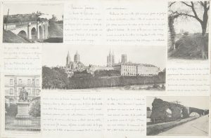 Normandie. Le document est signé des initiales E.O. Il débute par un titre aquarellé en couleurs dont l’encadrement rappelle la ferronnerie. Suit le récit du voyage qui commence le lundi 16 septembre 1907. Partis de Bayeux, les voyageurs se rendirent à Coutances, au Mont Saint-Michel, à Dol-de-Bretagne, Avranches, Granville et Saint-Lô. L’intérêt de ce document provient non seulement du récit, à la fois sensible et cultivé, mais également des 152 cartes postales de l’époque qui ont été collées pour illustrer le voyage. Petites rousseurs.