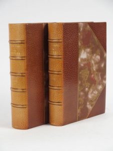 HUGO (Victor). Les Misères. Première version des Misérables, avec douze portraits au lavis par G. Pavis. Paris, Baudinière 1927. 2 vol. in-4. 1/2 maroquin havane à coins, tête dor., couv. et dos cons. Bel exemplaire sur vélin grenu, num. 12 planches d'illustrations h.-t. Dos éclairci.