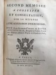 •11. Second mémoire à consulter et consultation, sur la défense à une accusation d'escroquerie. Paris, Cailleau, 1786. [1] f., 29 p. (petit manque en marge sans atteinte au texte).