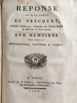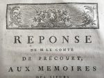 •16. Réponse de M. le Comte de Précourt, colonel d'infanterie, chevalier de l'Ordre Royal & Militaire de Saint Louis ; aux mémoires des sieurs d'Étienville, Vaucher & Loque. Paris, L.F. Prault, 1776. 16 p. (manque la fin de cette plaquette ; mouillure claire en marge de tête).