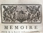 •1. Mémoire pour M. le B[ar]on de Fages-Chaulnes, Garde-du-Corps de Monsieur, frère du Roi, accusé contre les sieurs Vaucher et Loque, Marchands bijoutiers, accusateurs... Paris, chez Prault, 1786. [1] f., 30 p.