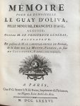 •7. Mémoire pour la demoiselle Le Guay d'Olivia, fille mineure, émancipée d'âge, accusée ; contre M. le procureur général, accusateur ; en présence de M. le cardinal-Prince de Rohan, de la dame de La Motte-Valois, du sieur de Cagliostro, & autres ; tous co-accusés. A Paris, chez P.G. Simon & N.H. Nyon, 1786. [2] f., 46 p.