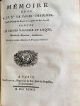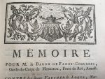 •11. Mémoire pour M. le B[ar]on de Fages-Chaulnes, garde-du-corps de Monsieur, frère du Roi, accusé. Contre les Sieurs Vaucher et Loque, marchands bijoutiers, accusateurs. Et encore contre Monsieur le Procureur Général. A Paris, chez Prault, 1786. [1] f., 30 p.