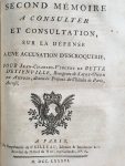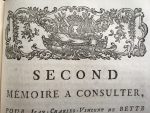 •12. Second mémoire à consulter et consultation, sur la défense à une accusation d'escroquerie, pour Jean-Charles-Vincent de Bette d'Etienville, bourgeois de Saint-Omer en Artois, détenu ès prisons du Châtelet de Paris, accusé. A Paris, Imp. Cailleau, 1786. [1] f., 28 p.