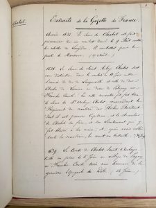 * [Manuscrit]. — CHABOT. — Extraits de la Gazette de France. — Petit in-4, 10 feuillets, demi-basane rouge à coins, titre en long doré [Gaëtan Ronner].