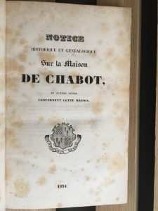 * [CHABOT]. — Notice historique et généalogique sur la Maison de Chabot, et autres pièces concernant cette maison. — Paris, Imp. Dezauche, 1834. — In-8, [2] f., 231 p., demi-basane havane époque, dos lisse, titre, fleuron et date dorés...