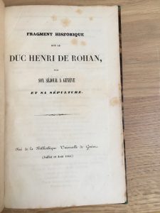 * [CRAMER (F.)]. — Fragment historique sur le Duc Henri de Rohan, sur son séjour à Genève et sa sépulture. —Tiré de la Bibliothèque universelle de Genève (Juillet et Août 1844). — In-12, 52 p., demi-basane rouge époque, dos à 5 nerfs,...