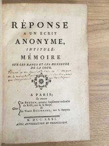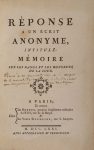 * [GEORGEL (Jean-François)]. — Réponse à un écrit anonyme intitulé : Mémoire sur les rangs et les honneurs de la cour. — A Paris, chez Le Breton, la Vve Duchesne, 1771. In-8, VIII-228 p., veau havane marbré, dos lisse orné, pièce de...
