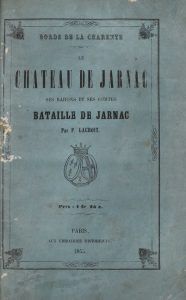 * LACROIX (P.). — Bords de la Charente. Le Château de Jarnac, ses barons et ses comtes. Bataille de Jarnac. — Paris, Aux librairies historiques, 1855. — In-8, [1] f., 71 p., demi-chagrin rouge début XXe s., dos à 5 nerfs, titre doré, couv....