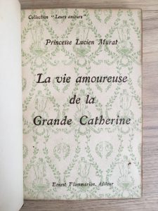 * MURAT (Princesse Lucien). — La vie amoureuse de la Grande Catherine. — Paris, Flammarion, 1927. — In-12, [2] f., 183 p., demi-chagrin noir à coins époque, dos à 5 nerfs, auteur, titre et date dorés, tête dorée, couv. conservées (mors...