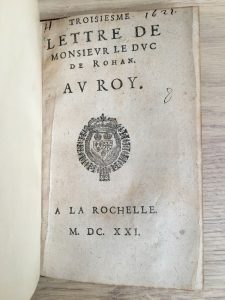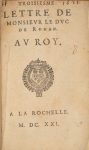 * [ROHAN (Henri de)]. — Troisième lettre de Monsieur le Duc de Rohan au Roy. — A La Rochelle, 1621.— In-8, 7 p., demi-chagrin havane XIXe s., titre doré en long (dérelié, restauration habile en marge aux p.5-6).