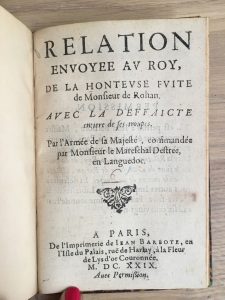 * [ROHAN (Henri de)].— Relation envoyée au roy, de la honteuse fuite de Monsieur de Rohan avec la deffaicte entière de ses troupes par l'armée de sa Majesté, commandée par Monsieur le Maréchal Destrée en Languedoc. — A Paris, de l'Imp. de...
