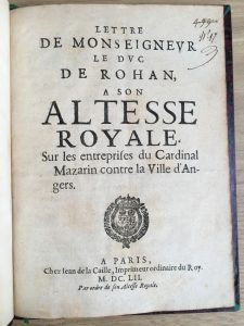 * ROHAN (Henri de Chabot de). — Lettre de Monseigneur le Duc de Rohan à son Altesse royale sur les entreprises du Cardinal Mazarin contre la ville d'Angers. — A Paris, chez Jean de la Caille, 1652. In-4, [1] f., 7 p., [1] f., demi-chagrin...
