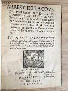 * [ROHAN (Marguerite de)]. — Arrest de la cour du Parlement de Paris, donné à l'audience le XXVI Février 1646, en la cause d'entre Dame Marguerite de Bethune Duchesse doüairière de Rohan : — Et Me Jacob Joly Procureur en ladite cour, tuteur...