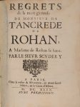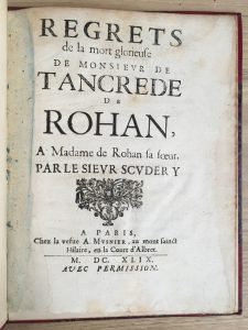 * SCUDERY (Georges de). — Regrets de la mort glorieuse de Monsieur de Tancrède de Rohan, à Madame de Rohan sa soeur. — A Paris, chez la Veuve A. Musnier, 1649. — In-4, 4 p., demi-basane rouge à coins XIXe s., titre doré (petites taches aux...