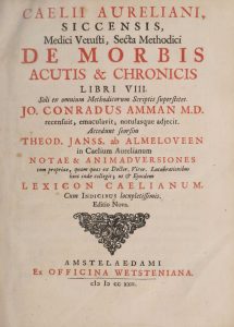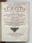 AURELIANUS (Caelius). — De morbis acutis et chronicis libri VIII. — Amstelodami, ex Officina Wetsteniana, 1722. — In-4, [1] f., 32-728 p., basane havane mouchetée époque, dos à 6 nerfs, pièce d'auteur, caissons ornés, tranches mouchetées...