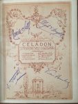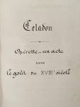 – [Manuscrit]. STERN (Jean). Céladon. Opérette en un acte dans le goût du XVIIIe siècle. Petit in-4 carré, 86 p., maroquin bleu, dos à 5 nerfs, auteur, titre, lieu et dates dorés, filets dorés au dos, 25 étoiles dorées au plat sup., double filet doré d'encadrement aux plats, double filet doré aux coupes, tranches dorées, large dentelle dorée intérieure [Vermorel] (piqures, petits frottements).