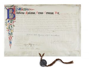 ♦ Superbe bulle pontificale, enluminée et rehaussée d'or, ornée de son sceau et de sa cordelette tressée intacts.