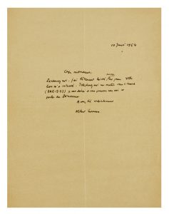 CAMUS (Albert) — Billet autographe signé. — S. l., 10 juin 1954. — 1 demie p. sur 1 f. in-4 (27,1 x 20,9 cm).