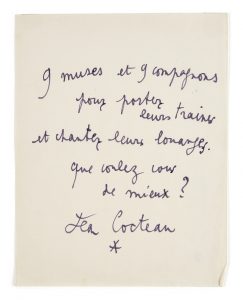 Le dessin est accompagné, sur une feuille séparée, d'une légende signée : " 9 muses et 9 compagnons pour porter leurs trains et chanter leurs louanges. Que voulez-vous de mieux ? "