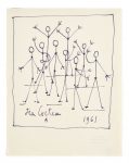 Amusant dessin original de Jean Cocteau, au feutre, signé et daté de 1961, représentant les 9 Compagnons de la chanson, de manière stylisée.