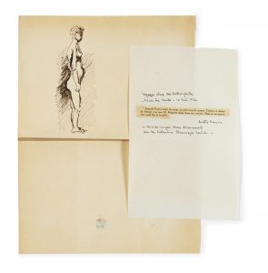 – 1 dessin à l'encre, représentant une femme nue, se tenant debout, de profil. 1/2 page sur 1 f. in-folio (35 x 22,8 cm). S. l. n. d.