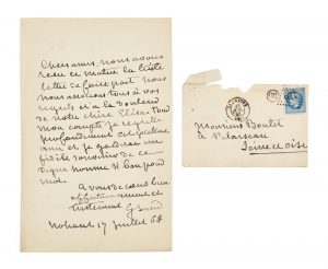 SAND (George) — Lettre autographe signée. — Nohant, 17 juillet 1868. — 1 p. sur 1 double f. in-8 (20,6 x 13,3 cm), timbre sec GS et 1 enveloppe.