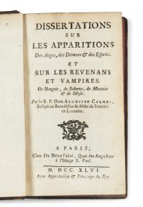 CALMET (Augustin) — Dissertations sur les apparitions des anges, des démons & des esprits et sur les revenans et vampires. — Paris, De Bure l'aîné, 1746. — In-12 (16,1 x 9,5 cm), veau moucheté brun, filet à froid en encadrement sur les...