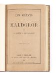 LAUTRÉAMONT (Comte de) — Les Chants de Maldoror (Chants I, II, III, IV, V, VI). — Paris et Bruxelles, En vente chez tous les libraires, 1874. — In-12 (19 x 11,8 cm), reliure janséniste, maroquin framboise, dos à nerfs, tranches dorées,...