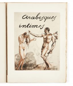 LOBEL-RICHE (Alméry) — Arabesques intimes. — [Neuilly-sur-Seine, 1936]. — In-folio (38,4 x 28,7 cm), en ff., couverture avec le titre calligraphié à l'encre verte, étui-boîte. — [2] ff., titre, justification et 23 figures hors texte.