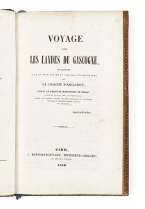 MORTEMART de BOISSE (François Gerôme Léonard, Baron de) — Voyage dans les Landes de Gascogne, et rapport à la Société royale et centrale d'agriculture sur la colonie d'Arcachon. — Paris, L. Bouchard-Huzard, 1840. — In-8 (20,9 x 12,5 cm),...