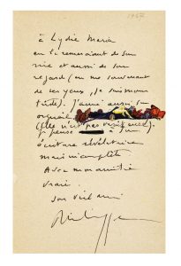 " À Lydie Maria en la remerciant de son rire et aussi de son regard (en me souvenant de tes yeux, je suis triste). J'aime aussi son orgueil. (Elle n'est pas vaniteuse). Je pense à son écriture révélatrice mais incomplète. Avec mon amitié vraie. son vieil ami. Philippe ".