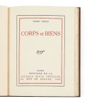 DESNOS (Robert) — Corps et biens. — Paris, Éditions de la NRF, 1930. — In-8 (21,5 x 15,8 cm), reliure janséniste, maroquin grège, dos lisse, doublures et gardes de daim saumon, tranches dorées, couverture et dos conservés, chemise et étui...