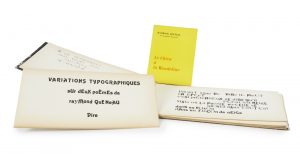 – Variations typographiques sur deux poèmes. [Paris], Dire, 1964. In-8 oblong (17 x 32,7 cm), en feuilles, couverture à rabat, chemise illustrée conçue et réalisée par Fernand Michel. [32 p]