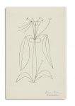 Ces trois esquisses au crayon de couleur bleu représentent des fleurs aux pétales, aux feuillages et aux pistils variées, dans le style graphique, décoratif et audacieux typique de l'artiste.