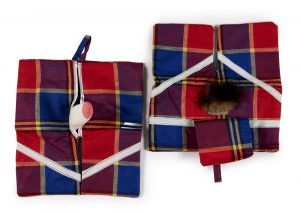 Un des exemplaires du tirage de grand luxe limité à 20 exemplaires numérotés (n° XVII), comprenant un tirage sur papier japon nacré des lithographies originales signées par les artistes et un " couple de tabliers ", " mâle " et " femelle ", deux Readymades (20,3 x 17,7 cm) et (20,5 x 19,8 cm) de Marcel Duchamp, signés et datés à l'encre de blanchisseuse " Marcel Duchamp 59 ". Pour réaliser ces Readymades, Duchamp acheta une paire de maniques en tissu écossais dans un bazar de New York avant d'y ajouter les divers éléments visant à " rectifier " ces objets quotidiens et à les sexualiser.