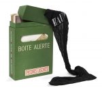 photographie en noir montrant la " boîte alerte ", boîte en carton de l'éditeur à l'imitation d'une boîte aux lettres (18 x 28 x 6 cm), recouverte de papier vert avec fenêtre et couvercle, titre imprimé en blanc et rouge sur blanc sur la boîte, couvercle coulissant (présentation de l'éditeur). — 141 p., [1] p., [1] f.