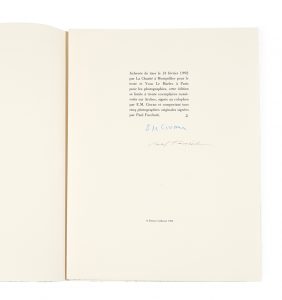 Édition ornée de 5 grands portraits photographiques d'Henri Michaux signées par Paul Facchetti, en tirage original. Un des 30 exemplaires sur papier vélin d'Arches (n° 2), signés par Cioran.