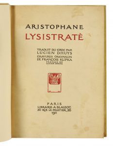 KUPKA.- ARISTOPHANE — Lysistraté. — Paris, Librairie A. Blaizot, 1911. — In-4 (28,5 x 19,5 cm), parchemin moderne décoré, avec vignette centrale au premier plat, dos à nerfs orné, couvertures et dos conservés. — [2] ff., XIV p., [1] f,...