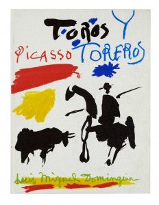 PICASSO.- DOMINGUIN (Luis Miguel) — Toros y toreros. — Paris, Cercle d'Art Éditeur, 1961. — In-4 (36,7 x 26,9 cm), cartonnage de l'éditeur, toile grise ornée de reproductions en couleurs de dessins de Picasso, boîte.