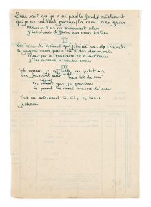 Le document offre les deux premières strophes en version définitive, et une troisième non retenue (les strophes II et III sont numérotées) :