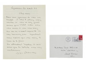 BRASSENS (Georges) — Lettre autographe signée à M. et Mme Fred Mella. — Lézardrieux, 24 août 1971. — 1 p. et 4 lignes in-4, enveloppe jointe.
